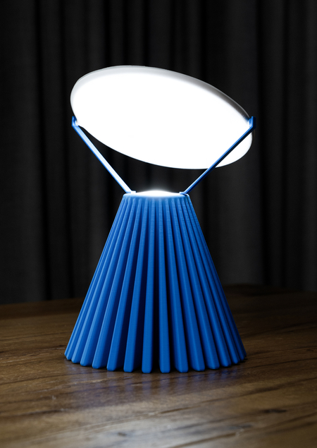 Лампа переносит принцип горизонта, где свет появляется и исчезает, в предметный дизайн. С помощью элемента, вращающегося вокруг своей оси есть возможность регулировки направления света. Лампа предлагает не режимы освещения, а переходы состояний.