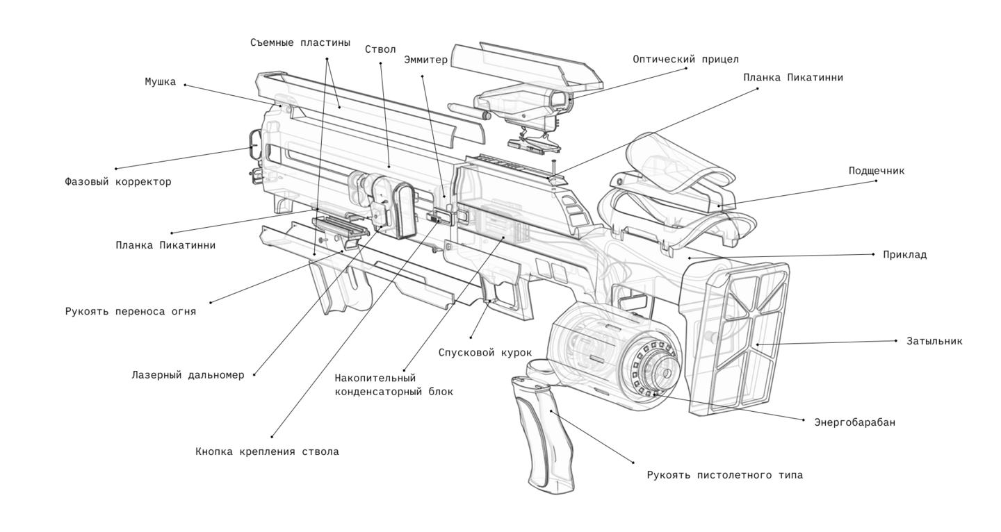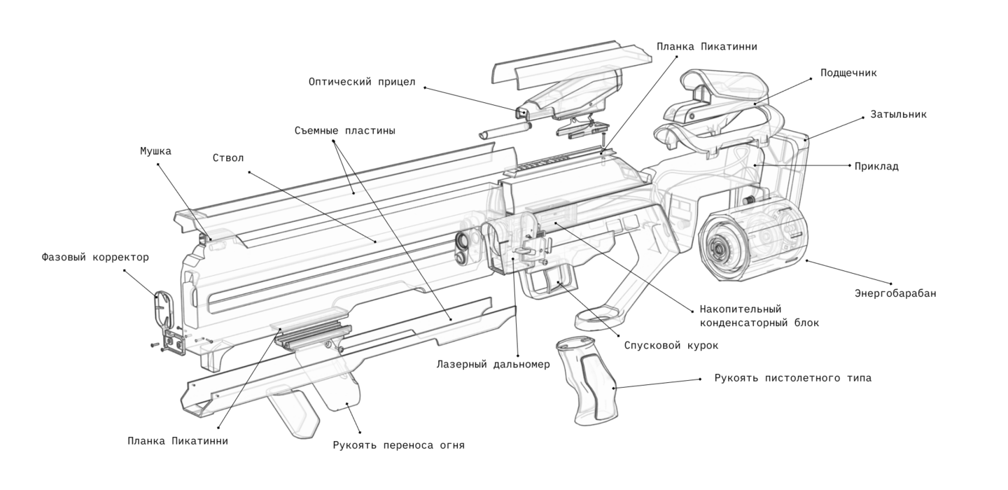 ‣ Перенос веса в приклад Энергобарабан размещён в прикладе, выступая в роли контрбаланса; центр масс смещён ближе к плечу стрелка.