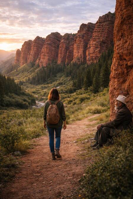 У подножия одной из скал сидел старик. Он выглядел так, будто был здесь всегда — не как сторож или экскурсовод, а как часть пейзажа. Он не смотрел на неё, но, казалось, знал о её присутствии.