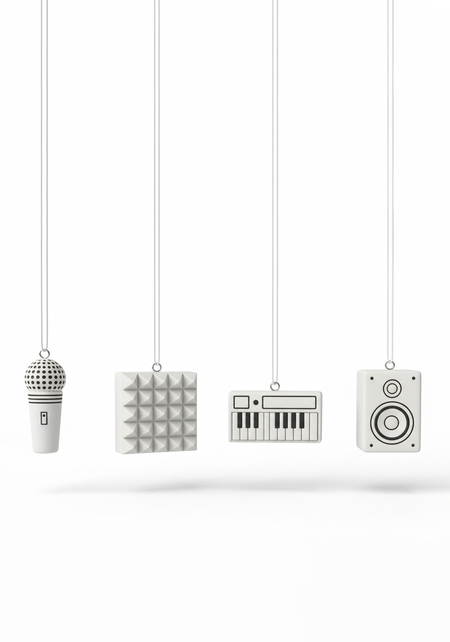 Эти ёлочные игрушки объединяет тема звукозаписи и аудиостудии. Каждая игрушка представляет важный элемент студийного оборудования — микрофон, акустический шип для звукоизоляции, MIDI-клавиатуру и аудиомонитор — выполненные в минималистичном бело-черном дизайне.