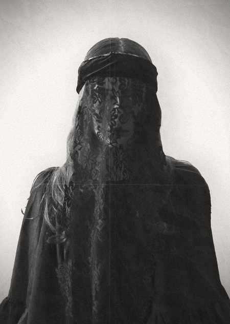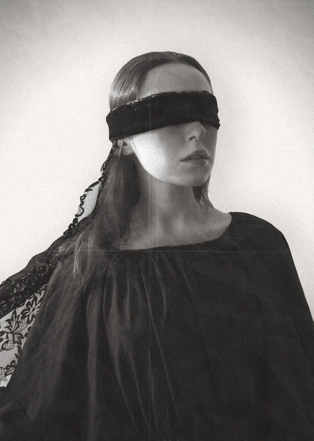 Финальное изделие приставляет собой бархатную черную маску с неровной фактурой — символ казни. Прорези для глаз закрыты черным кружевом, а задняя часть — длинный кружевной шлейф. Из маски объект превращается в траурную вуаль. По окружности верхней части маски пролегает толстый белый шнур, обернутый в черное кружево — это символ святости.