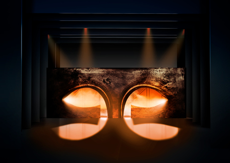 Центральный элемент сценографии спектакля «Орестея» — шлем Агамемнона, подвешенный над сценой. Он постоянно присутствует в пространстве действия, доминируя над персонажами и зрителем.