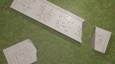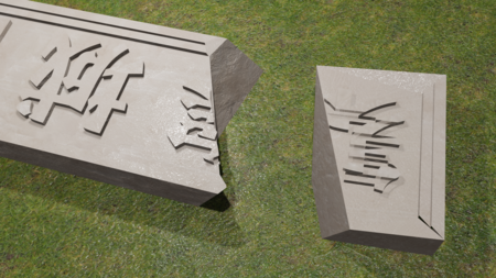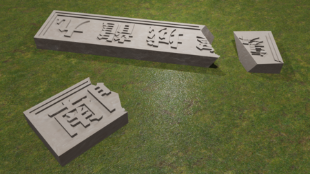 Расколотая табличка с ворот Коулуна, которая была найдена при раскопках после сноса города в 90х. Сейчас демонстрируется в парке Коулун как историческая ценность.