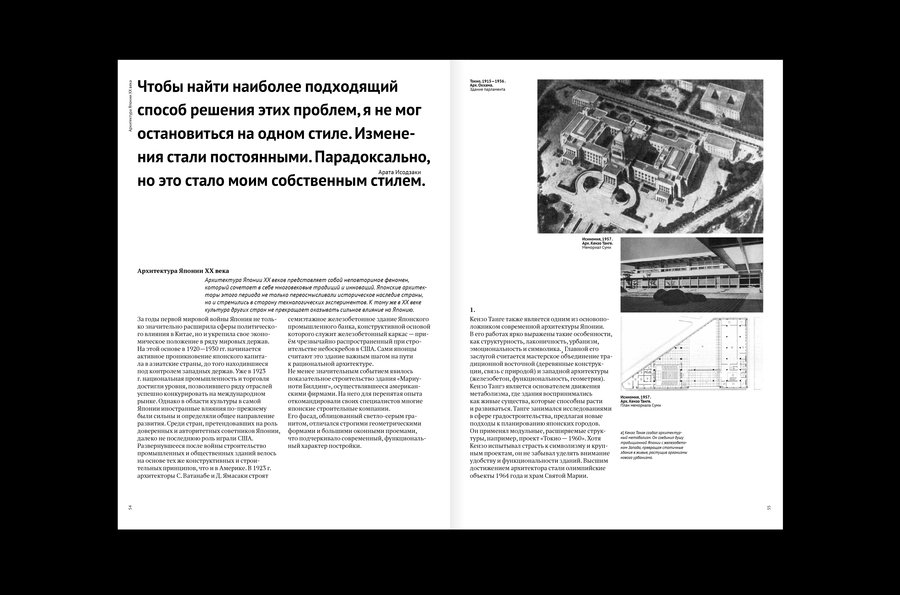 Типовой макет издания о японской архитектуре XX века, показывающий влияние американских технологий на её современный облик в период роста.
