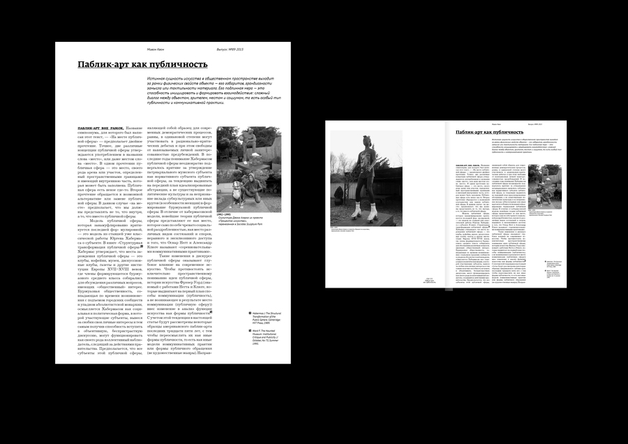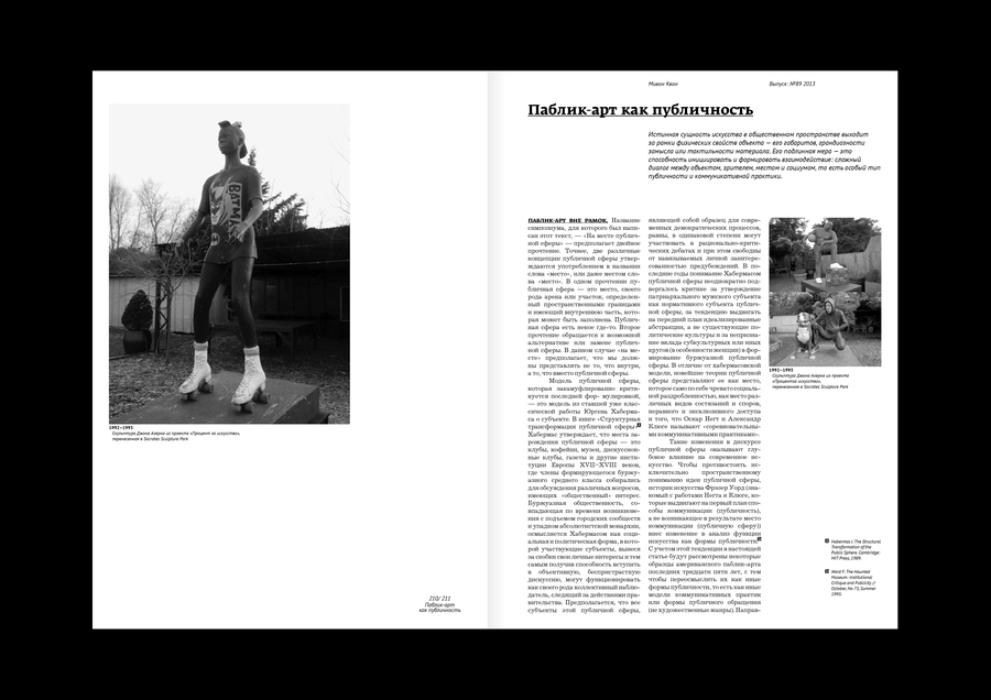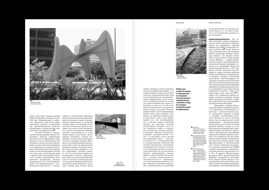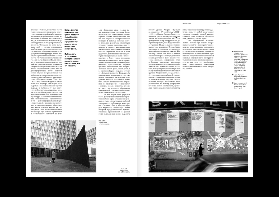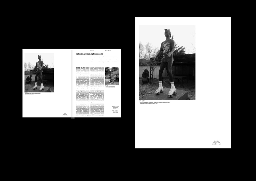 Типовой макет издания о паблик-арте, исследующий его путь от патерналистского «подарка» народу через критику авторитарных пространств к демократическому искусству соучастия и социальных изменений.