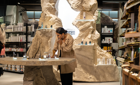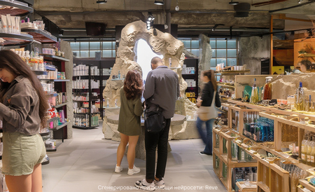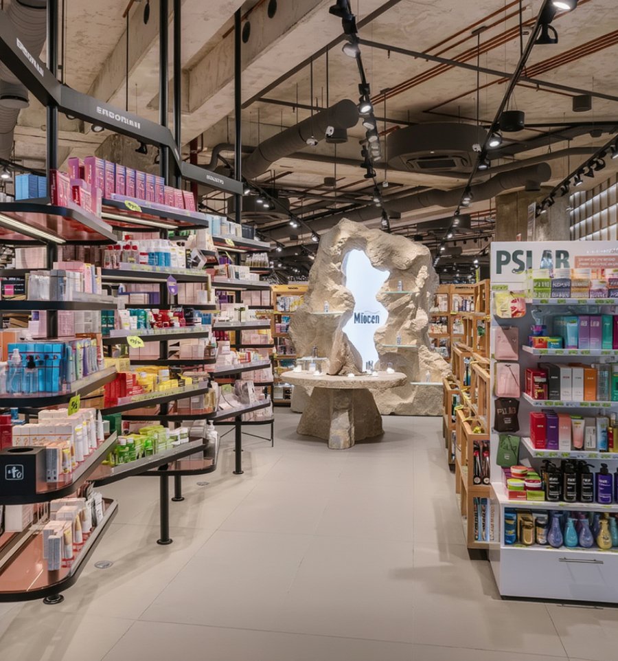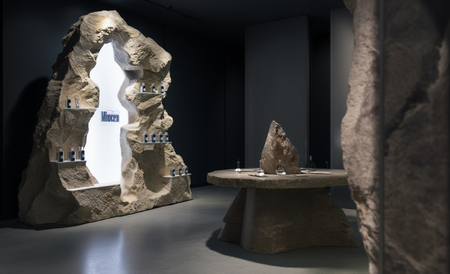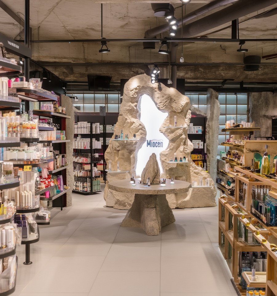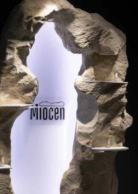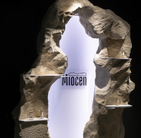 Витрина для бренда уходовой косметики на основе термальной воды из Венгрии «Miocen». Грубая форма витрины из миоценового песчаника контрастирует с тонкостью и чистотой термальной воды. Вода становится драгоценностью, очищающей не только кожу, но и внутреннее состояние человека.