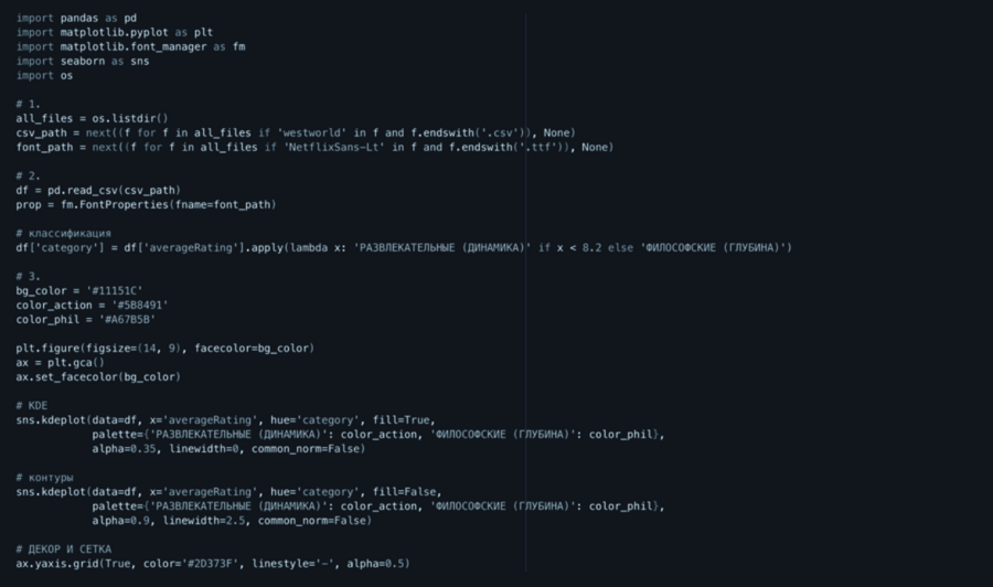 Я построила кривые плотности с помощью библиотеки seaborn и метода kdeplot. Видно, что «Философские» эпизоды (терракотовая зона) имеют более высокую концентрацию в области оценок 8.5–9.0, что подтверждает уникальность аудитории сериала, ценящей интеллектуальный контент.