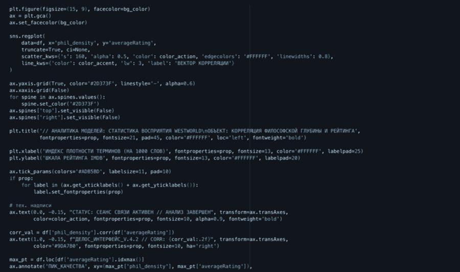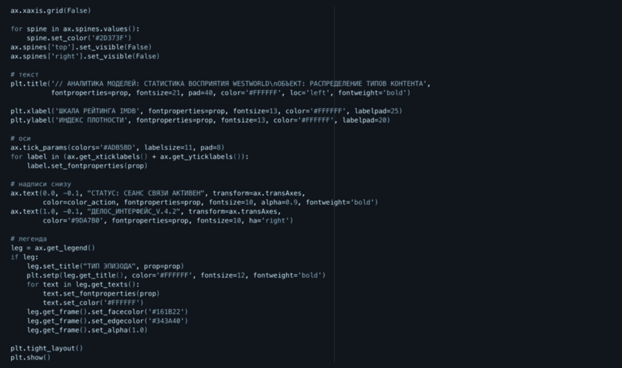 Визуальная составляющая работы была вдохновлена интерфейсом систем управления парком «Мир Дикого Запада». Для оформления графиков использована темная палитра, имитирующая терминалы операторов DELOS. Внутренние надписи выполнены шрифтом Netflix Sans Light , который подчеркивает технологичность и минимализм проекта. Все текстовые элементы в графиках прописаны капсом (UPPERCASE), что соответствует эстетике системных отчетов.