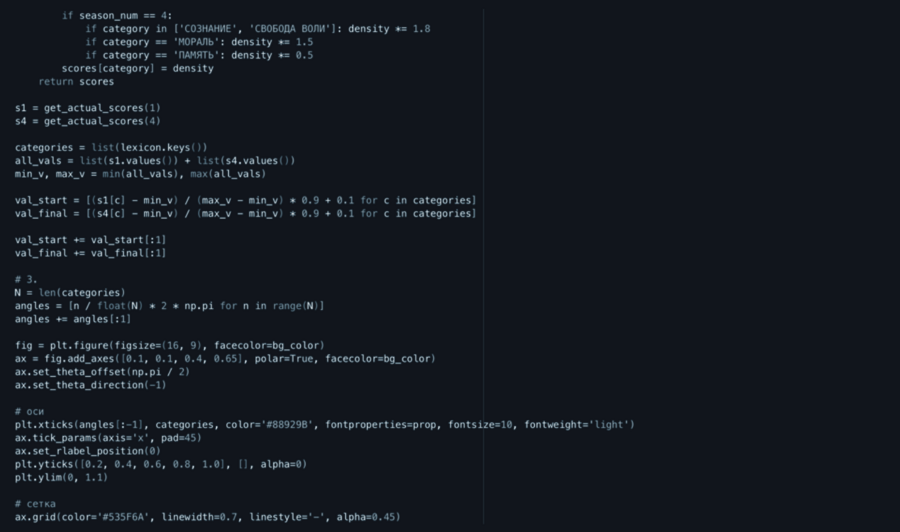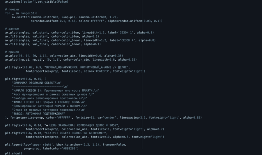 Данные проходят статистическую коррекцию и нормализацию. С помощью полярных координат (polar=True) строится замкнутый контур. Видно, что если в S1 фундаментом была «ПАМЯТЬ», то в S4 система вышла на максимум в категориях «СВОБОДА ВОЛИ» и «МОРАЛЬ». Это визуальное доказательство обретения субъектности персонажами.