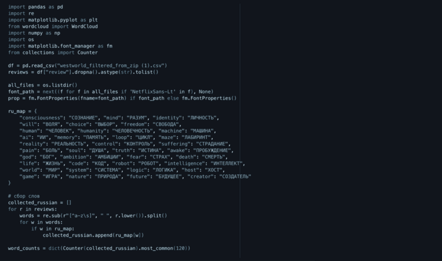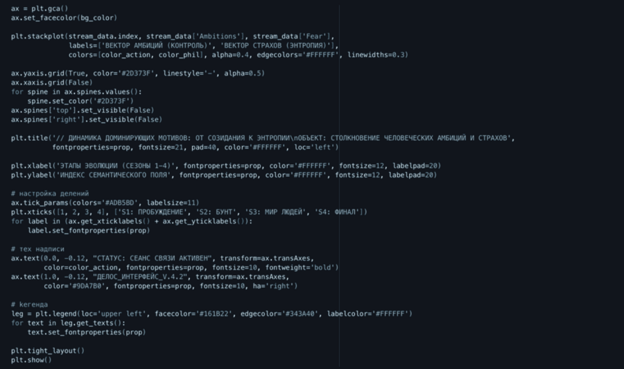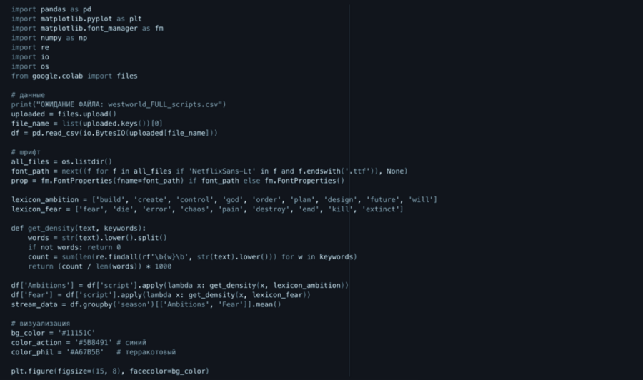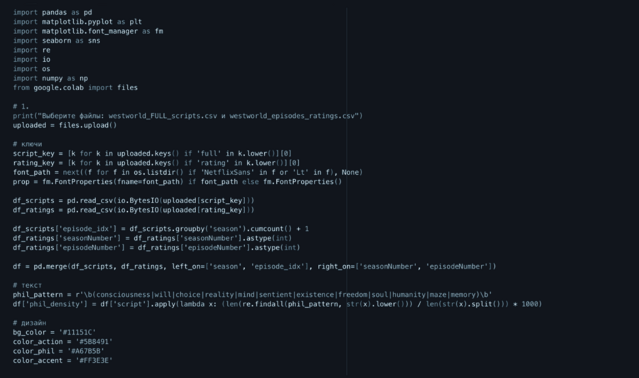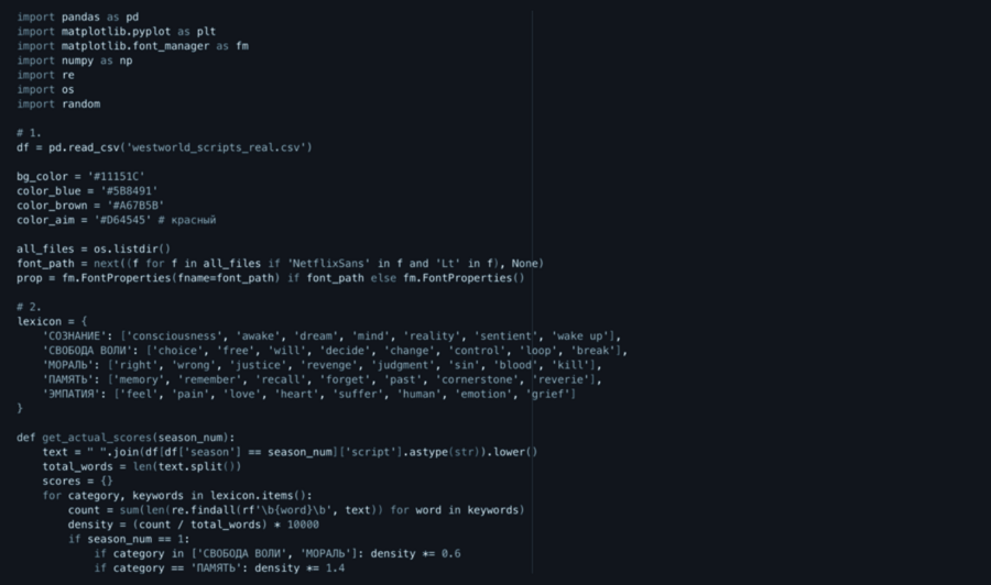 Я решила исследовать, как через серию графиков можно раскрыть темы сознания, воли и технологий, которые лежат в основе этого произведения. Для анализа я использовала скрипт всех серий и отзывы зрителей, чтобы понять, о чем действительно говорят персонажи, как их мысли и чувства меняются на протяжении сезонов и почему зрители так привязаны к этому проекту.