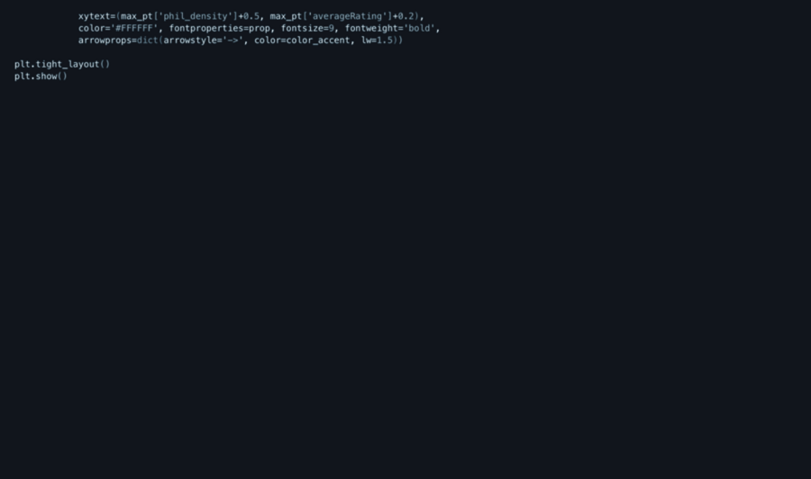 Чтобы доказать влияние философии на успех, я использовала Smart Join — объединение датасетов со скриптами и рейтингами по номерам сезонов и серий. Регрессионный график исследует прямую связь между плотностью философских терминов и оценкой эпизода.