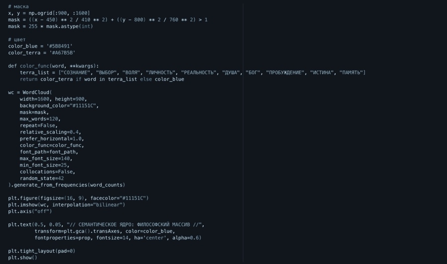 Для создания максимальной наглядности было создано облако слов (word cloud) из текстов отзывов. Процесс подготовки данных включал фильтрацию английских текстов через составленный мной список философских терминов и их последующий перевод на русский язык. Это позволило сфокусироваться на значимых категориях, отсекая бытовую лексику и технические стоп-слова.