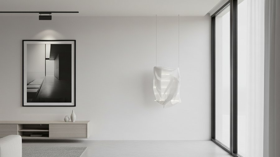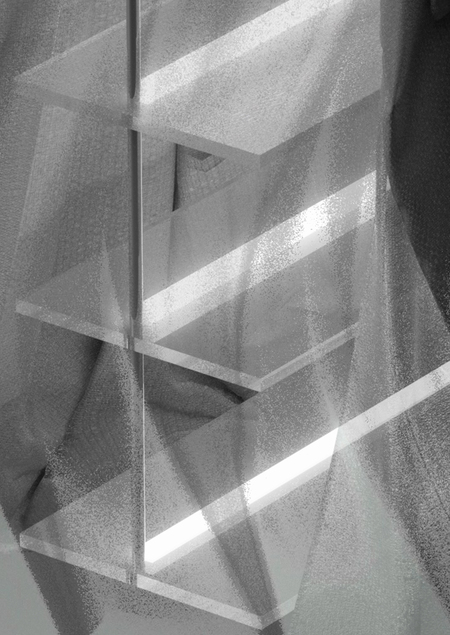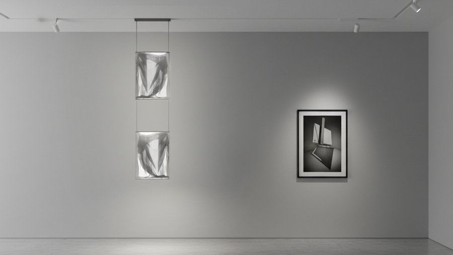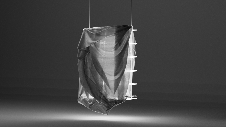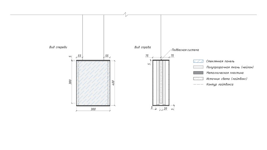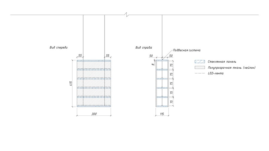 Материалы: — Полупрозрачная ткань (нейлон) — Гибкий металлический каркас (стальная проволока Ø 2–4 мм) — Лайтбокс — LED-ленты — Металлическая подвесная система — Стеклянные панели