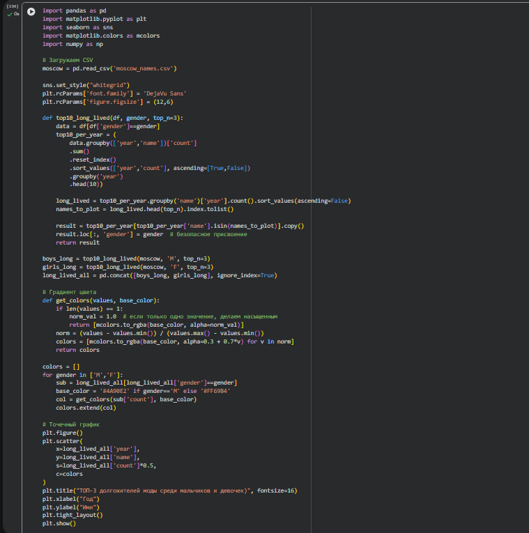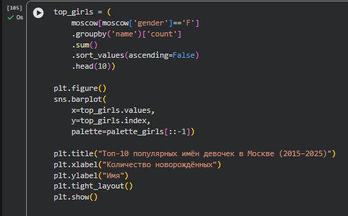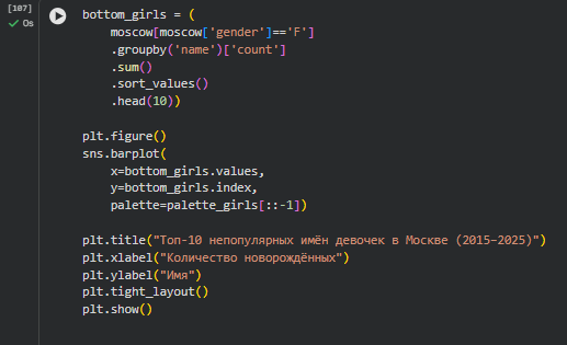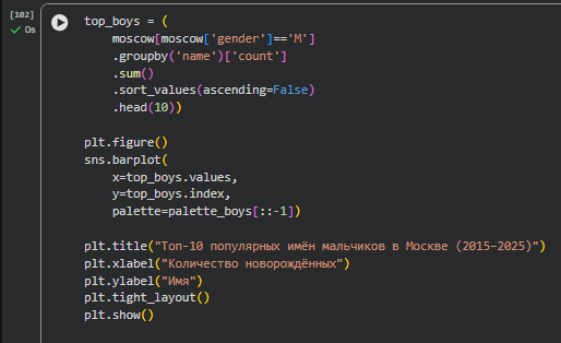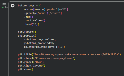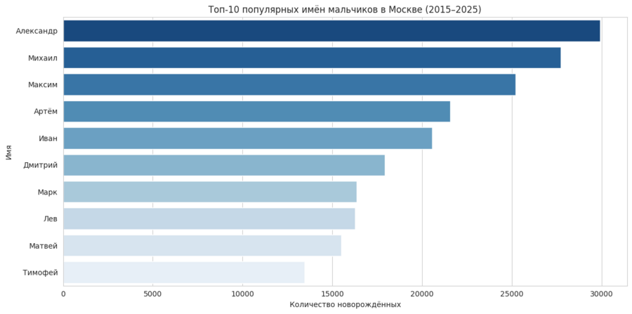 В проекте анализируется динамика популярности имён новорождённых в Москве за период 2015–2025 годов на основе открытых данных правительства города Москвы.