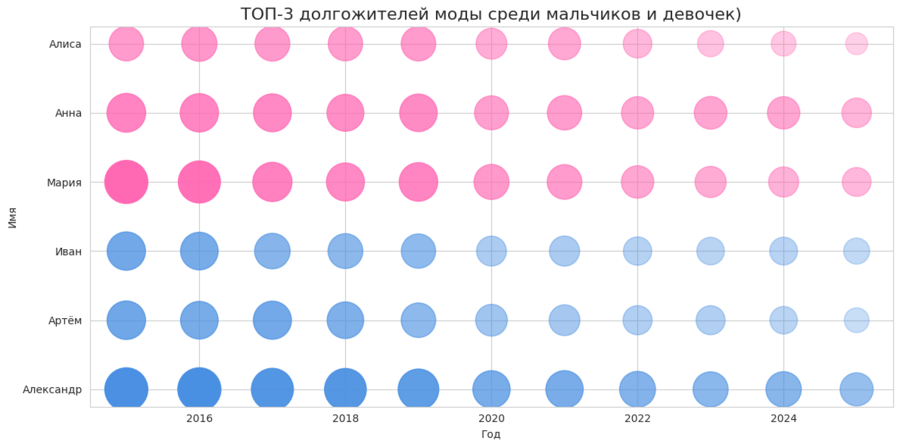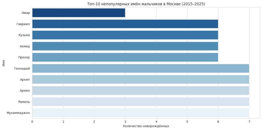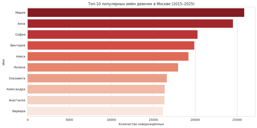 Анализ моды на имена новорождённых в Москве за 2015–2025 годы показал сочетание устойчивых трендов и краткосрочных всплесков популярности: некоторые имена сохраняют лидерство на протяжении нескольких лет, а новые и редкие имена появляются и быстро исчезают из ТОП-10. Гендерные различия проявляются в том, что мода на имена девочек более динамична, тогда как мальчики демонстрируют более стабильные тенденции. В целом, проект позволяет увидеть, какие имена становятся «классикой», а какие отражают временные модные тренды.