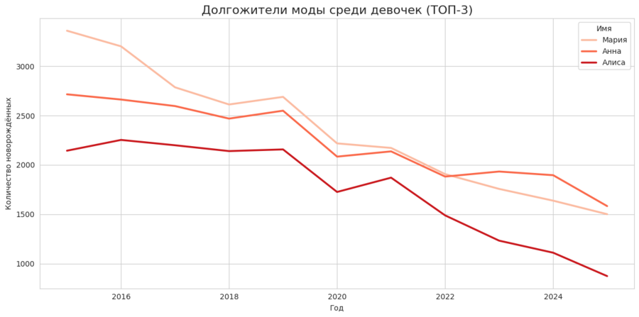 Вывод Имена-долгожители демонстрируют устойчивость моды на имена. Сравнение мальчиков и девочек показывает, какие имена сохраняют популярность дольше, а какие тренды более подвижны.