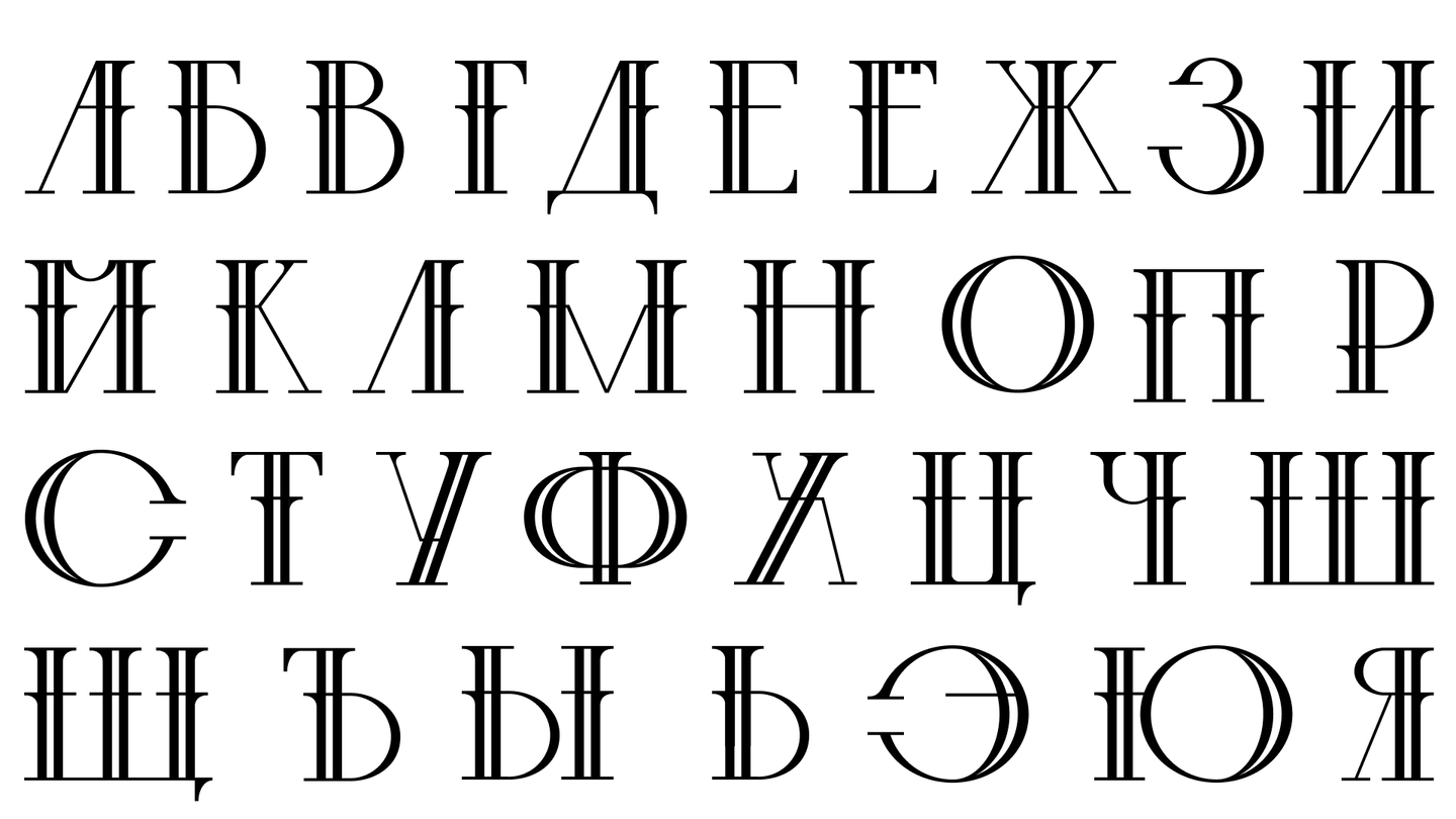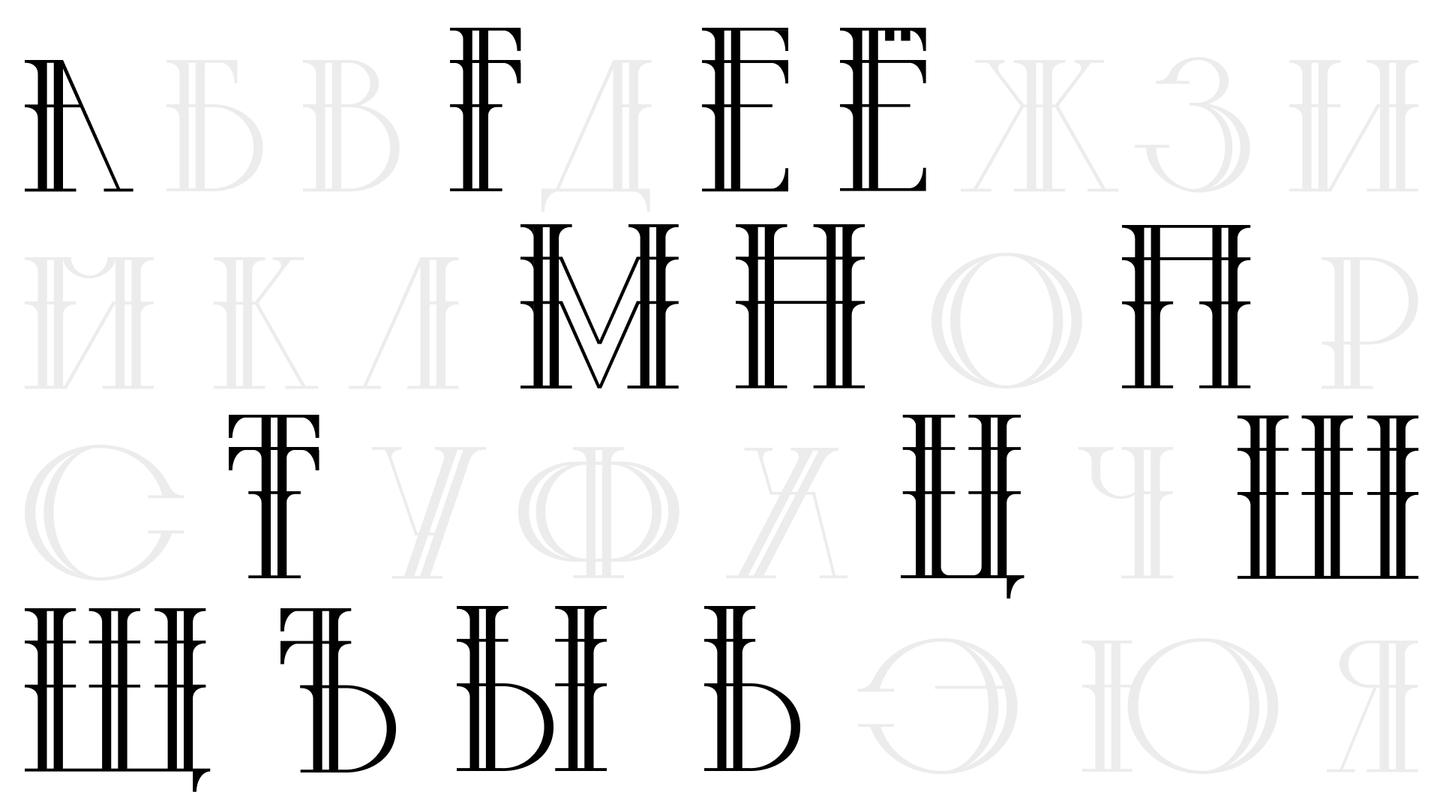 Для проекта был разработан акцидентный шрифт с набором альтернативных символов. В основе концепции — стилистика ампира, ярусность и рост глифов в высоту.