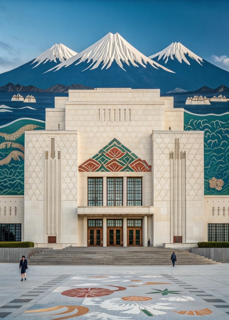 Stylized illustration of the Far East Museum building, centered and dominant, with clean geometric architecture. The building facade features subtle abstract patterns inspired by indigenous Far Eastern crafts — waves, mountains, islands, and traditional textile motifs. Background: Kamchatka volcanoes, taiga forests, and ocean, simplified into harmonious shapes. Color palette: deep ocean blue, warm terracotta, soft taiga green. Dramatic, eye-catching composition, modern poster style, minimalistic yet vibrant, emphasizing cultural heritage, architecture, and connection with nature. Suitable for a striking museum project cover