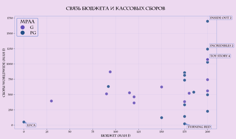 Следующий сделанный мною график показывает связь между бюджетом и мировыми кассовыми сборами фильмов Pixar. Самым кассовым мультфильмом Pixar за все время является фильм «Головоломка 2», собравший свыше 1,68 миллиарда долларов, тем самым став еще и самым кассовым мультфильмом в истории. Также на графике подписаны 2 самых провальных мультфильма Pixar по сборам — «Лука» и «Я краснею». Низкие кассовые сборы скорее всего связаны не с качеством самих мультфильмов, а с тем, что оба проекта пришлись на пандемийный период и выходили без широкого театрального проката в США. Стоит отметить, что в датасете для «Лука» в колонке budget стоит 0, скорее всего автор датасета не нашел информацию о бюджете фильма и поставил 0.