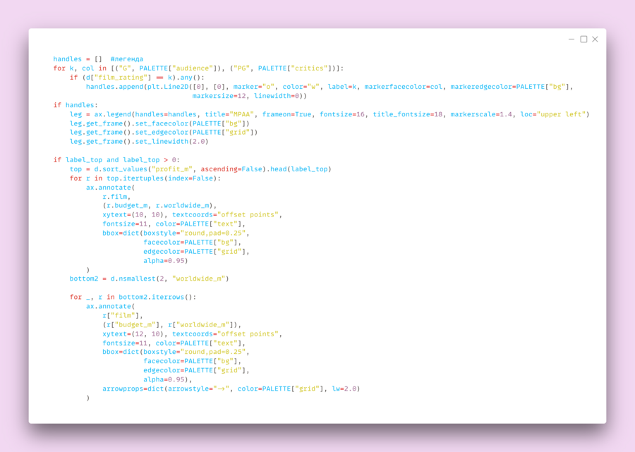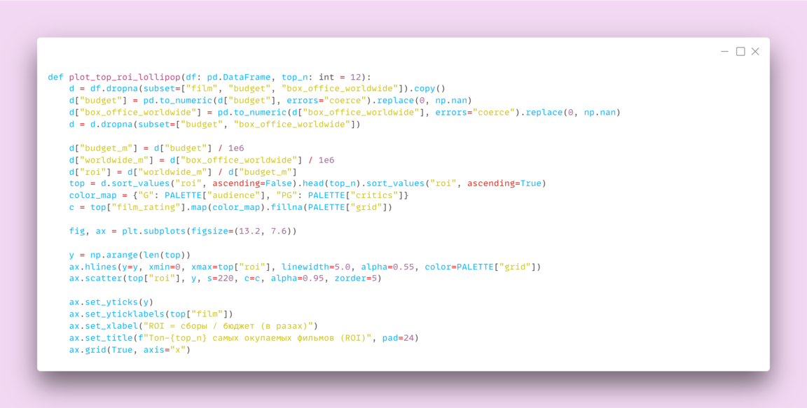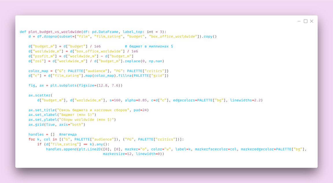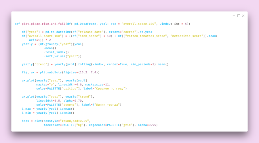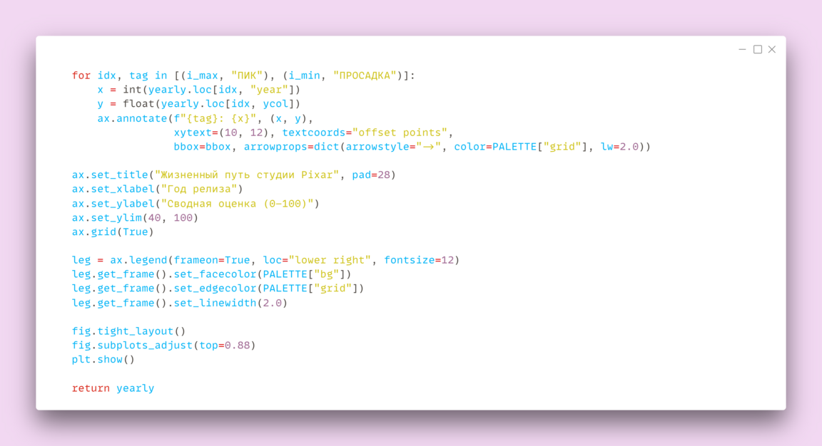 Далее загружается датасет из файла pixar_films new.csv в таблицу DataFrame (df). После этого рассчитываются несколько новых столбцов, которые нужны для анализа: оценка зрителей приводится к шкале 0–100 (audience_score_100 = imdb_score * 10), оценка критиков берётся как среднее Rotten Tomatoes и Metacritic (critics_score_100). Также высчитаем здесь разрыв мнений зрителей и критиков — gap, а также его модуль abs_gap, чтобы находить самые «спорные» фильмы независимо от знака.