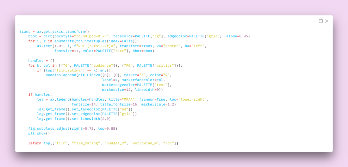 У меня был достаточно большой простор для изучения и исследования, так как выбранный датасет предлагал большой объем информации о мультфильмах Pixar. Я постаралась собрать всю информацию воедино и максимально ее систематизировать, разбив на группы вопросов: 1. Чем отличаются оценки критиков и зрителей у фильмов Pixar? 2. На какие MPAA-рейтинги Pixar получает более высокие оценки? 3. Как связаны бюджет и кассовые сборы у фильмов Pixar? 4. Какие фильмы окупались лучше всего (ROI) и что это показывает про стратегию студии? 5. Как менялось среднее качество фильмов Pixar по годам?