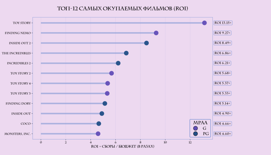 По результатам видно, что на верхних позициях оказываются фильмы, которые при относительно умеренном бюджете смогли собрать очень много — именно такие проекты дают максимальную отдачу на вложения. Лидер рейтинга — «История игрушек» (1995) преумножил вложения в 13 раз, что определенно положительно сказалось на развитии студии в своей время.
