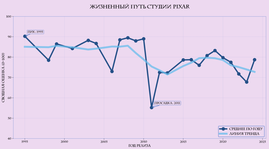 Каждая точка на графике — это средняя сводная оценка фильмов, вышедших в конкретный год, а линия, соединяющая эти значения, показывает чередование более удачных и более слабых периодов. Полупрозрачная линия тренда (скользящее среднее) сглаживает резкие скачки и помогает увидеть общую динамику «жизни» студии. К сожалению, по тренду заметно, что в последние годы средний уровень оценок постепенно снижается: если раньше у Pixar чаще встречались высокие пики, то ближе к современному периоду линия держится ниже и стабильных подъёмов меньше. Это можно интерпретировать как признак того, что студии всё сложнее удерживать прежний уровень качества на длинной дистанции — хотя отдельные сильные работы всё равно появляются и формируют локальные подъёмы на графике.
