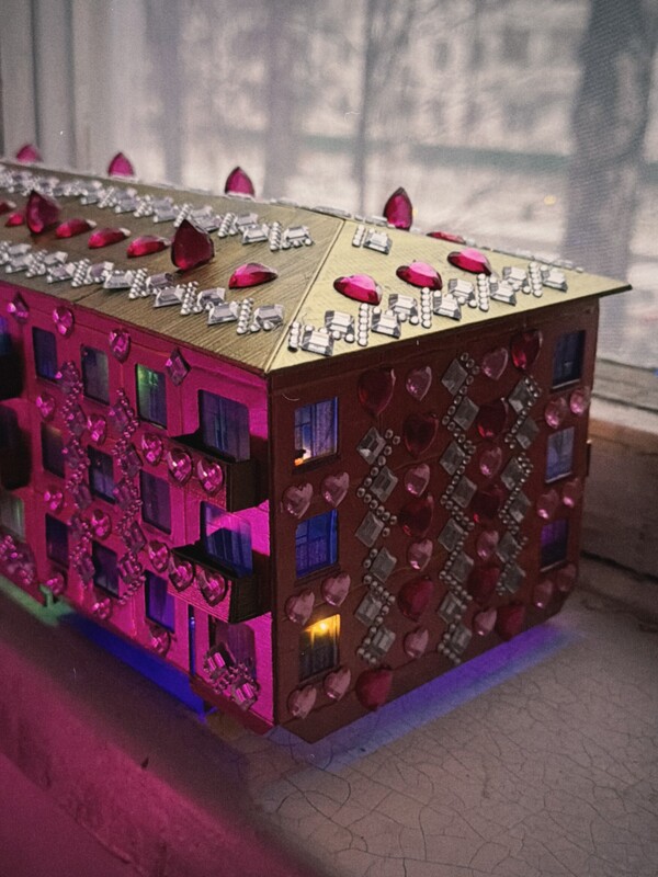 Панелька — собирательный образ постсоветской архитектуры, знакомый каждому из нас. Ее переосмысление вдохновлено работой томской арт-группы «Малышки 22:18». В прошлом их отец создал герб для Каргасокского района Томской области, а сегодня они перерабатывают уже существующую геральдику сибирских городов в своем стиле: заменяют цвета на розовый, вместо химической колбы помещают на щит стразы, добавляют к стрелам сердечки.