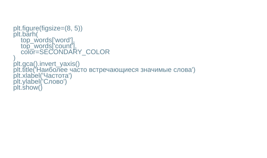 Затем я отбираю самые часто встречающиеся слова и визуализирую их в виде горизонтальной столбчатой диаграммы. Такой формат удобен для сравнения: сразу видно, какие слова доминируют, а какие находятся на периферии.
