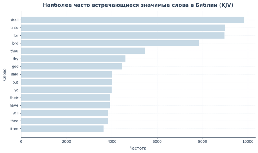 По этому графику хорошо видно, что текст Библии во многом строится вокруг служебных и повторяющихся формулировок, а также ключевых религиозных понятий. Это задаёт основу для дальнейшего анализа: прежде чем говорить о смыслах, важно понять, какой языковой «фон» у текста в целом.