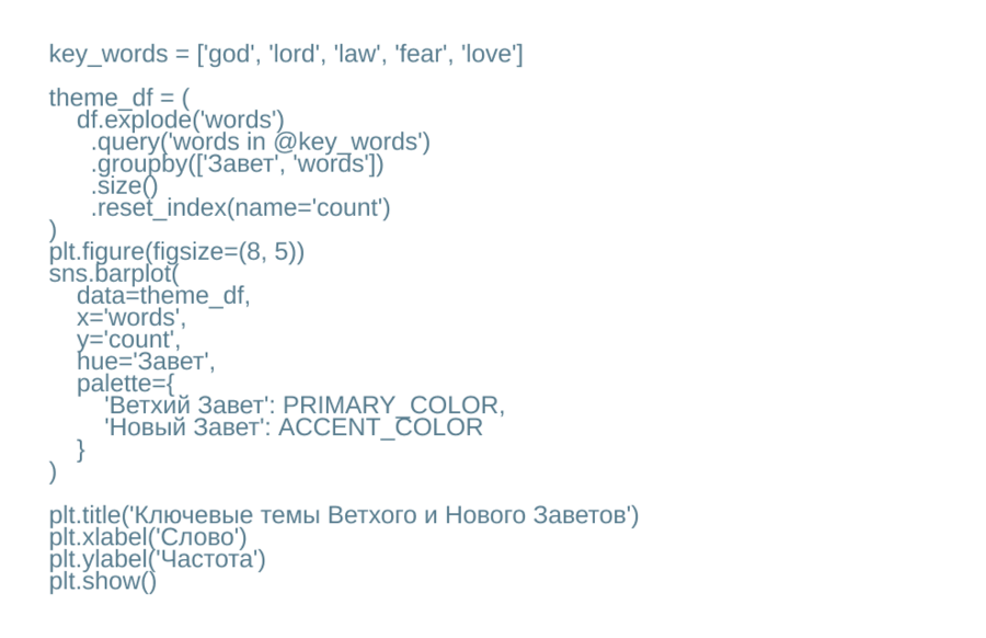 Для этого я выбираю несколько тематически значимых слов (например, god, lord, law, love, fear) и считаю, как часто каждое из них встречается в Ветхом и Новом Заветах отдельно. Результат я показываю в виде столбчатой диаграммы с разбиением по Заветам.
