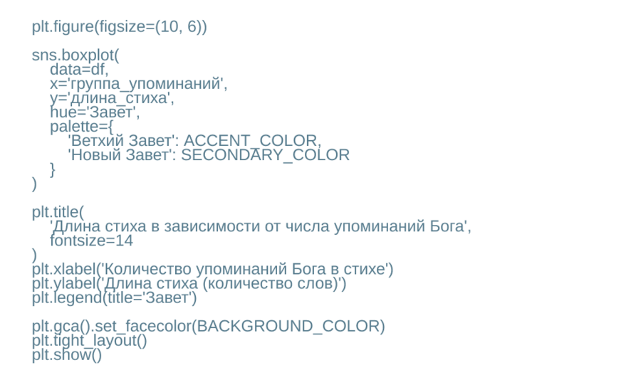 Для каждого стиха я считаю, сколько раз в нём встречаются слова god и lord, а также определяю длину стиха — количество слов. Затем я группирую стихи по числу упоминаний Бога (0, 1, 2 и 3+) и сравниваю распределения длин стихов отдельно для Ветхого и Нового Заветов с помощью boxplot.