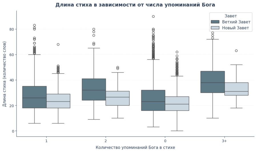 4. Boxplot длины стиха в зависимости от числа упоминаний Бога. Отражает, как меняется длина стиха (в количестве слов) при разном числе упоминаний Бога, а также позволяет сравнить распределения для Ветхого и Нового Заветов.