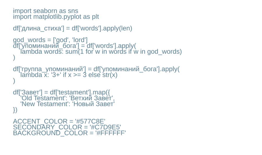 Pandas Основной инструмент для работы с данными. Использовался для загрузки CSV-файла (read_csv), очистки и подготовки текста, создания новых признаков (длина стиха, количество упоминаний Бога, группировки по Заветам), а также для агрегаций и подсчётов частот (value_counts, groupby), необходимых для визуализаций.