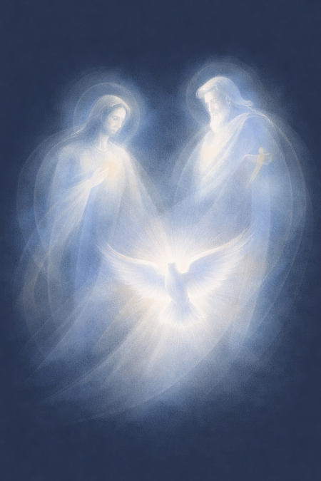 Обложка проекта была сгенерирована в ChatGPT промт: An abstract, ethereal illustration of the Holy Trinity. Three softly glowing figures emerging from darkness: God the Father and Jesus Christ represented as tall, luminous human silhouettes with gentle halos, and the Holy Spirit as a radiant dove of light between them. The figures are intentionally blurred and partially dissolved, especially toward the legs, creating a floating, weightless feeling. Soft painterly textures, heavy blur, and glowing light effects. Calm, spiritual, and minimalistic mood. Color palette limited to deep navy blue (304258), muted blue-gray (577C8E), pale blue (C7D9E5), and soft white (FFFFFF). No sharp details, no realistic faces, dreamlike abstraction, sacred atmosphere, smooth gradients, digital painting style.