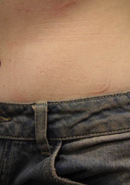 В этой работе память выносится на поверхность тела и становится видимой. Кожа здесь выступает не просто границей между человеком и внешним миром, а активным носителем опыта. Отпечатывая на своём теле бытовые предметы, я фиксирую момент единичного соприкосновения — краткого, почти незаметного взаимодействия с повседневной реальностью.