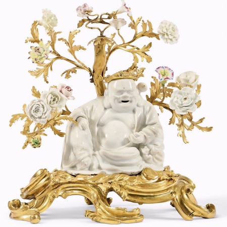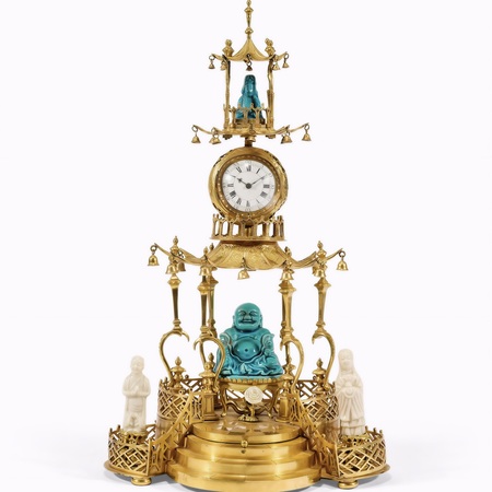 1. Фигура магота из белого китайского фарфора в стиле Людовика XV, середина XVIII в. 2. Часы-пагода в стиле Людовика XV с китайским фарфором, около 1740 г.