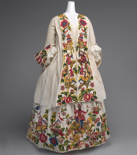 Переход от декоративной стилизации к моде происходит постепенно — через ткань, фактуру и домашнюю одежду. Одним из ключевых предметов становится мужской халат «Баньян», который в XVII–XVIII веках носили учёные, философы и представители элиты. Его свободный крой, текучая линия рукавов и мягкие ткани напрямую вдохновлены восточными силуэтами. Но главное — это материал: китайский шёлк, лаковые краски, вышивки, имитирующие традиционные орнаменты.