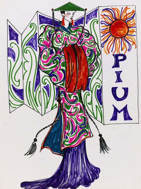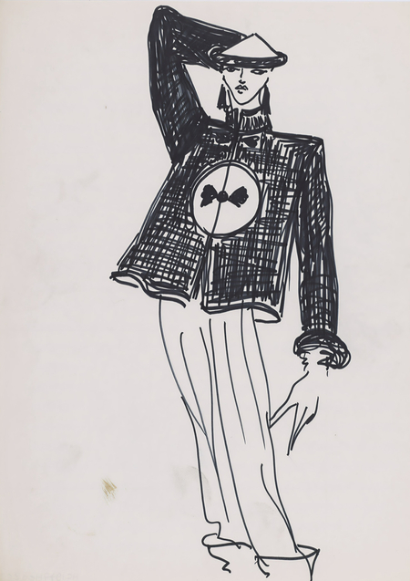 Оригинальный эскиз вечернего ансамбля с китайскими мотивами. Коллекция осень–зима 1977 года