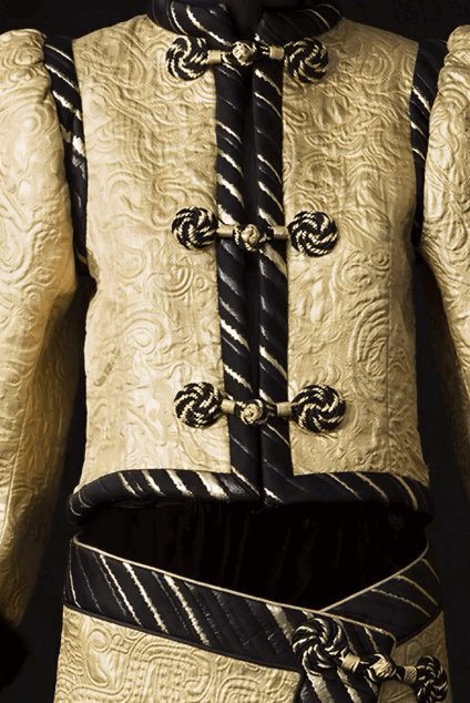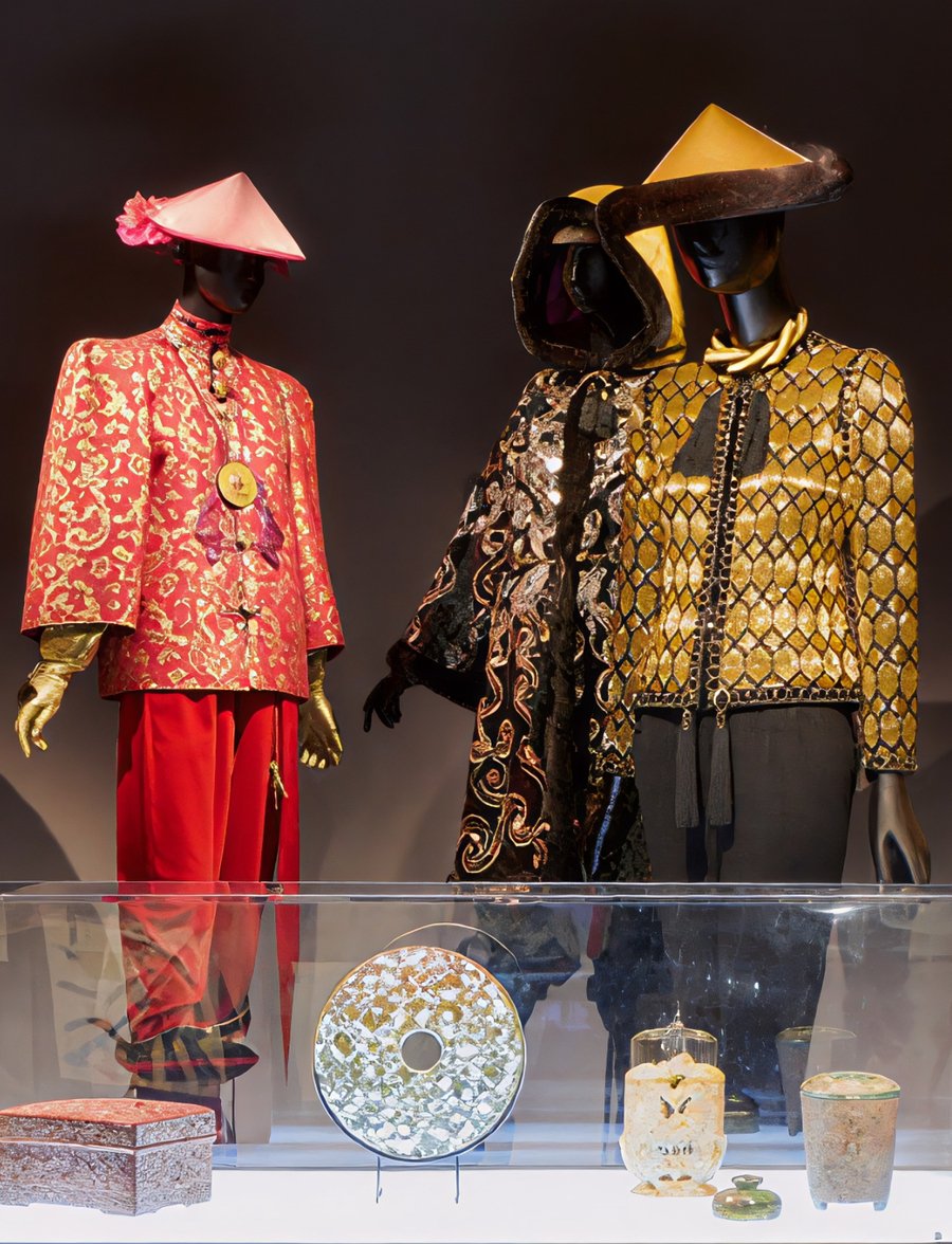 Обе модели демонстрируют характерную для коллекции 1977 года интерпретацию «китайского» кода через работу с текстурой, застёжками и декоративной плотностью, основанную на европейских представлениях об азиатской придворной эстетике.