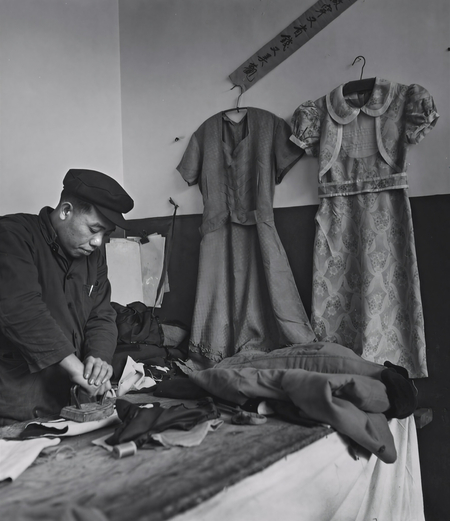 1. Рабочий комбинезон и ленинский френч 2. Работник швейного кооператива в городе Тяньцзинь шьёт платья из китайских халатов, 1957 год