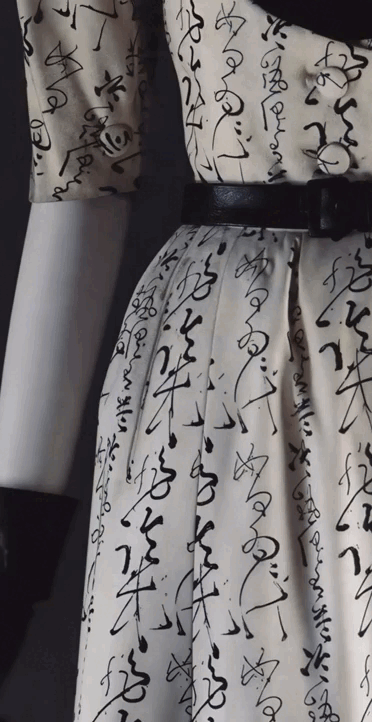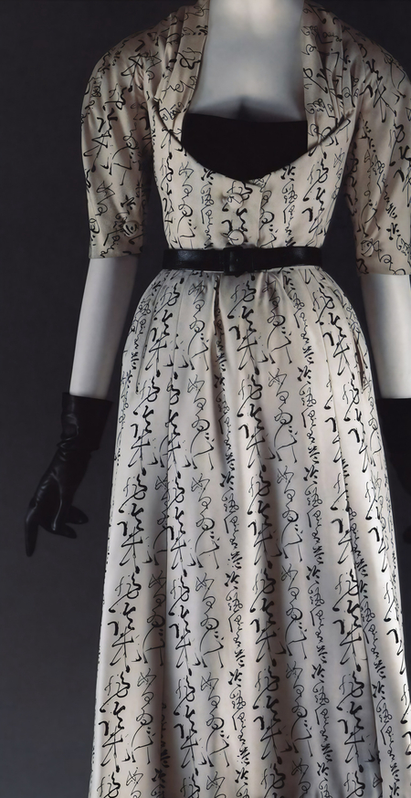 Использование каллиграфии в платье «Quiproquo» демонстрирует, как европейская мода начала 1950-х обращалась к китайской письменности не как к языку, а как к знаковой системе, воплощающей идею порядка и дисциплины. Спустя несколько десятилетий этот интерес к «политическому Китаю» получает иное направление