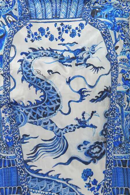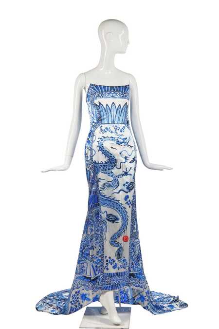 Кавалли переносит на ткань эстетику китайского бело-голубого фарфора, превращая орнамент сосудов эпохи Мин в графику вечерних платьев.