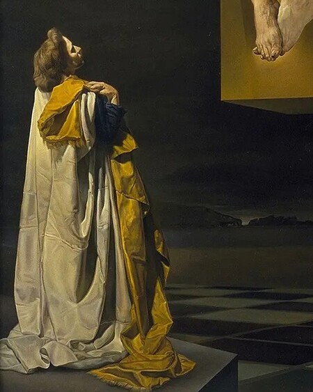 Во-первых, его лицо повернуто от зрителя, что не дает возможности точного определения Святого по лицу. Дали иначе пишет внешность Иисуса, лишает его обычных отличительных черт: длинных волос и бороды.