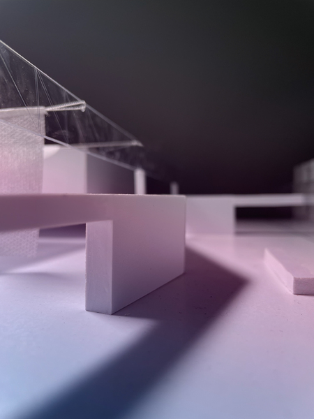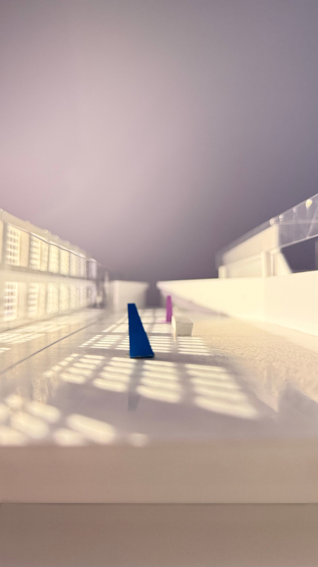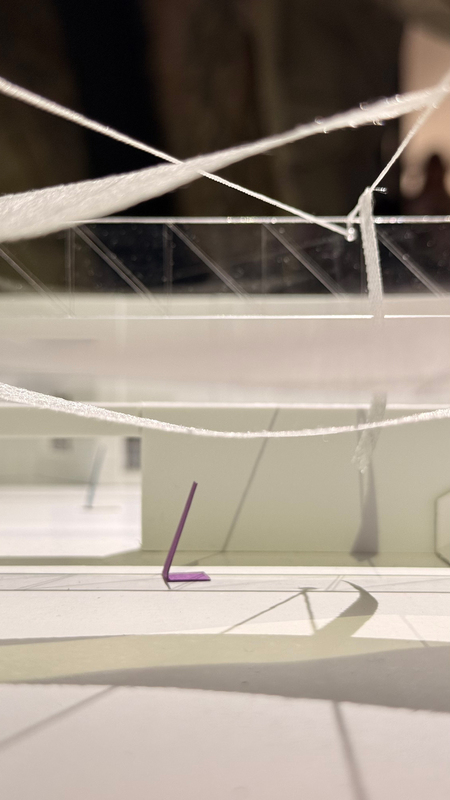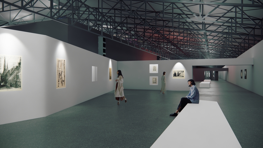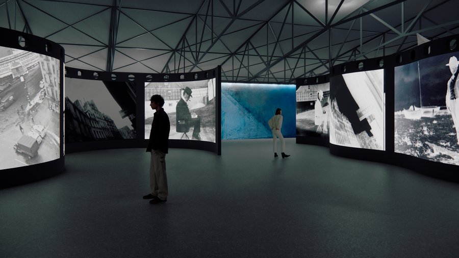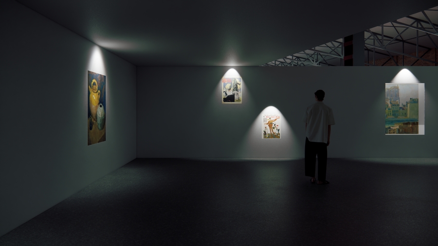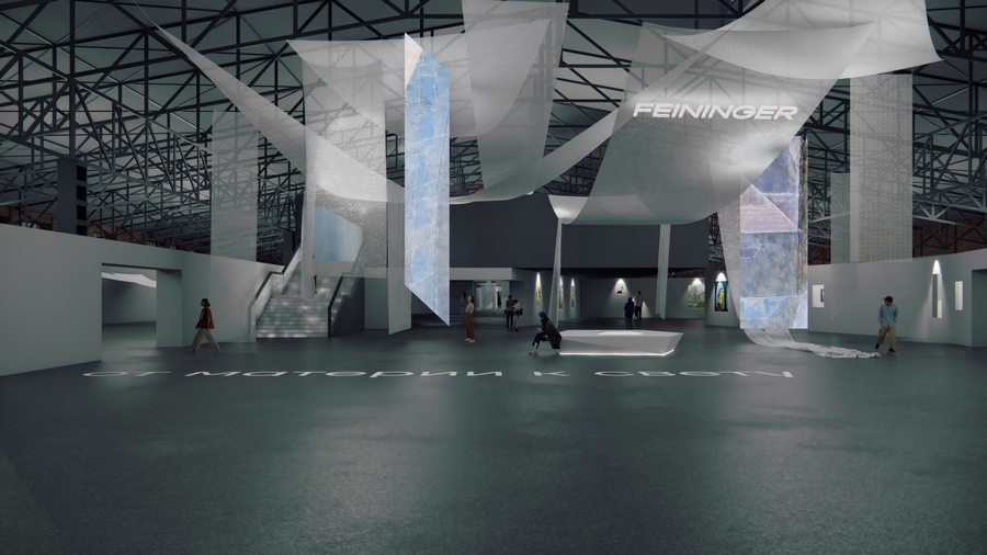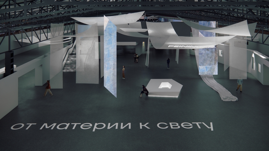 Выставка представляет собой ахроматическое пространство, в котором главную роль формирования цветовых пятен играет освещение.