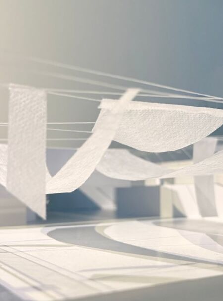 Полупрозрачные ткани, размещенные над всей экспозицией, еще больше передают ощущение зыбкости световых и цветовых отношений в полотнах художника.