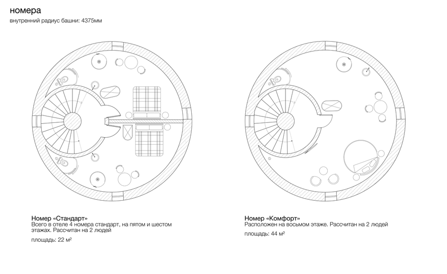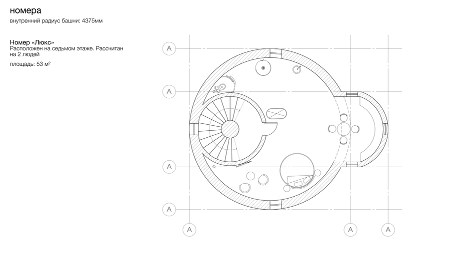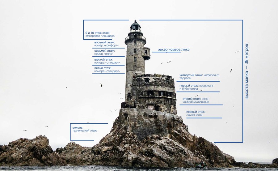 Концепция состоит в создании бутик-отеля внутри маяка путем возвращения маяку его узнаваемого силуэта и атмосферы. Отель в маяке Анива — это создание уникального опыта проживания на краю света. Ограниченное количество номеров, полное погружение в природную драматургию Сахалина: туман, море, ветер, изолированность.