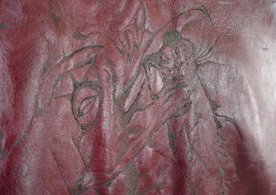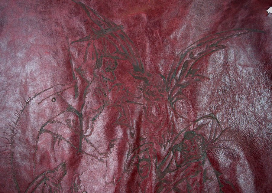 Графика выполняется паяльником на натуральной б/у коже, по памяти воспроизводятся средневековые канонизированные сюжеты.