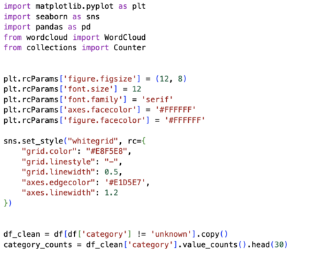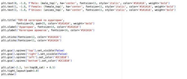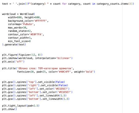 Используемые графики: [1] Облако слов для наиболее частотных категорий ароматов; [2] Столбчатая диаграмма; [3] Составная горизонтальная столбчатая диаграмма; [4] Круговая диаграмма долей; [5] Тепловая карта; [6] Виолин‑плот распределения категорий по аудиториям.