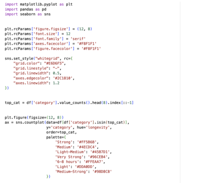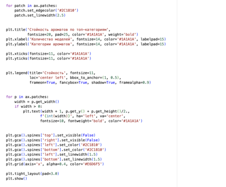 Диаграмма показывает, как распределяется стойкость ароматов внутри восьми самых популярных категорий. По горизонтальной оси отложено количество моделей, а по вертикали — категории. Это позволяет проанализировать не только предпочтения потребителей по стойкости запаха, но стойкость определенных запахов как таковую.